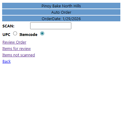 This is the main page. From this screen the GS can either scan the items UPC or type in the Itemcode.