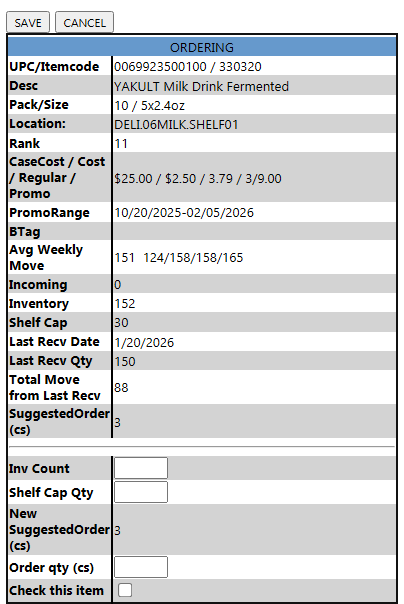 1. Inv Count – This number will override the current inventory number in the database. A new Suggested order will be calculated.